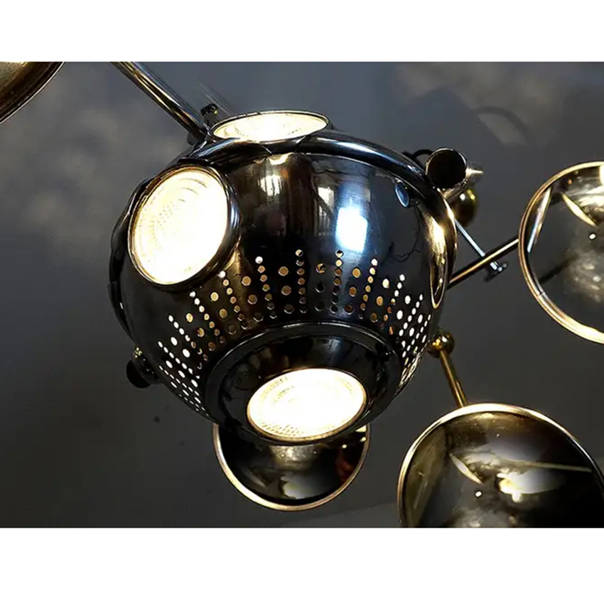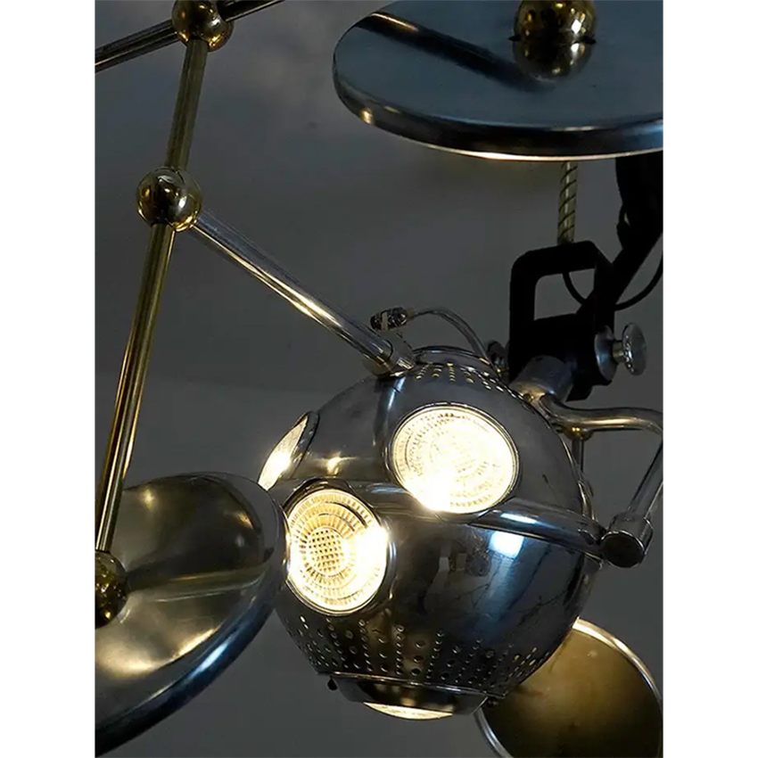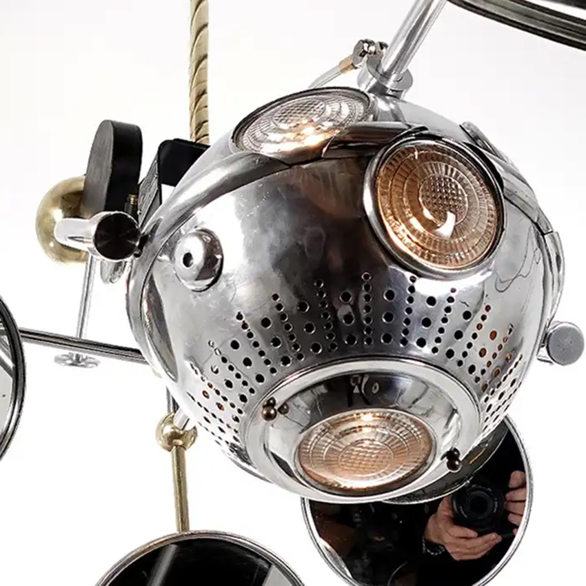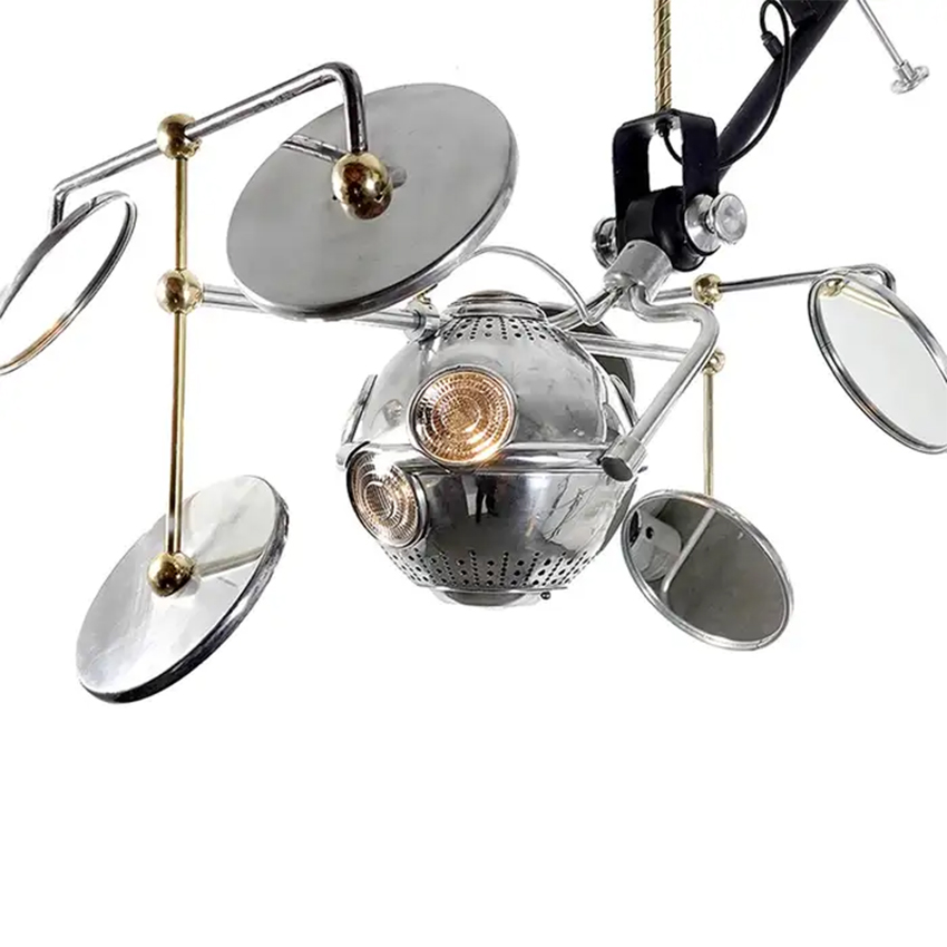 Some consider this lamp the “Holy Grail” of Industrial lighting and typical of the rare odd objects and lamps you will find on my web pages. You can’t make a more dramatic visual statement than this lamp! The 12 inch aluminum ball head has five lenses and reflectors. We added an inside look at those reflector concave lenses. Each lens has a large mirror on an out rigger frame dedicated to it. Each mirror is angled to pinpoint the light. So the surgeon can work with no shadows. The lamp is articulated with geared adjustments. It will move up and down from a it balanced center point as well as rotate and tilt. The whole unit hangs from a single point and moves with ease balanced by the polished brass weight ball. The lamp is extremely well made in spun and cast aluminum. It is also fully polished and restored. This is perfect for a dining or conference room. We can also finish the hight to your drop length… 48″ x 24″ x 38″ tall… $5400