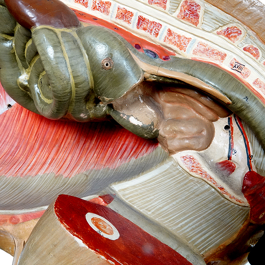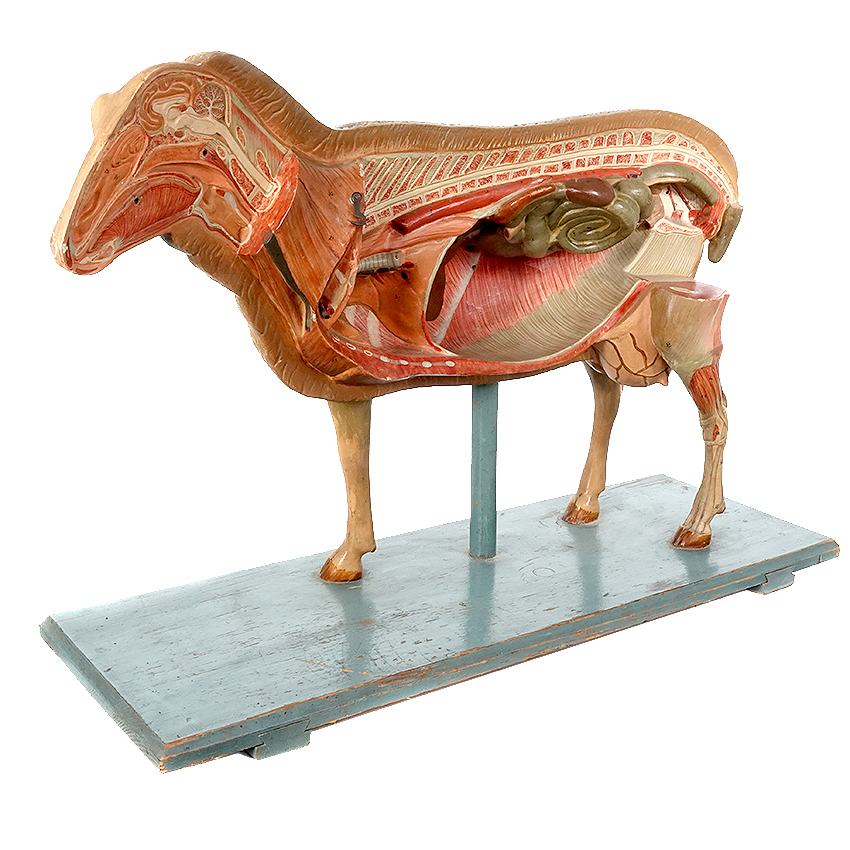 This rare German papier mâché teaching model measures over 28 inches long and 18.5 inches tall. The base is wood. One side shows a beautiful realistic animal and the other shows the musculature. These are getting very scarce… $2200